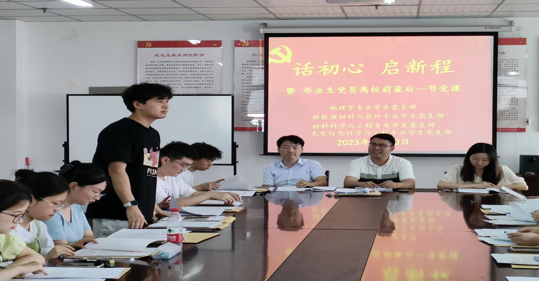 殷健飞、石灵婕代表毕业生党员发言。殷健飞分享了自己在党组织的指导和关怀下,在大学期间的成长与收获,真切表达了对党组织和学院的感谢与感恩;石灵婕表示虽然本科生活画上了句点,但是在今后要一如既往用党员的身份严格要求自己,坚定理想信念,在新的征途上发挥党员的先锋模范作用。