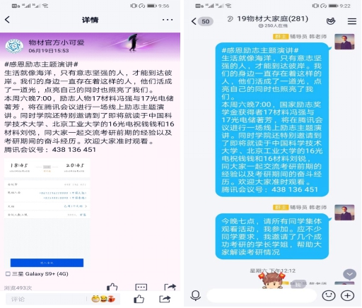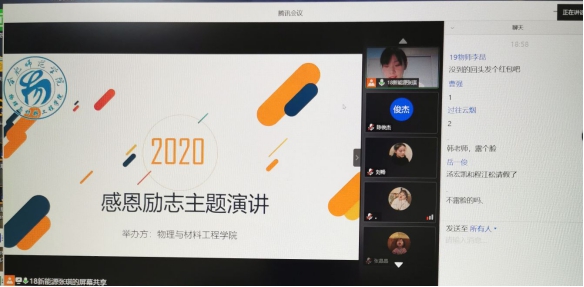 6月20日,永利yl23411集团利用腾讯会议平台举行感恩励志主题报告会。本次会议邀请2017级励志奖学金获得者孙锡妹、冯强,以及2016级已被中科大考研录取的祝钱钱、刘悦等同学和大家一起交流分享自己的大学成长和奋斗的历程。会议由张琪主持,2018、2019级全体学生及辅导员韩翔参加会议。