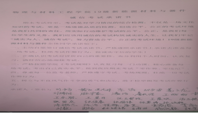 签署诚信考试承诺书,增强诚信意识。为进一步加强学生诚信意识,将诚信考试落到实处,确保将考试相关纪律要求传达给每一名同学,坚决抵制作弊行为,各学院印制承诺书,组织各班级同学签署诚信考试承诺书,要求同学们谨记承诺内容,克服侥幸心理,自觉抵制作弊行为,力求达到教育广大学生诚信考试的目的,激发学生学习动力。