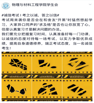 此外,物材学院通过学生成长导师教育指导、学生党员干部榜样示范,从多角度、多层面向学生强调诚信考试的重要性,让学生更加明晰考试违规作弊所产生的严重后果,从思想根源上打消考试作弊的想法,对学生行为起到警示和约束作用。营造了优良考风、学风,有力保障了诚信法纪教育的有效开展。(永利yl23411集团:韩翔)