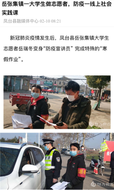 2月10日,凤台县融媒体中心对我院永利yl23411集团岳瑞冬同学志愿担任“防疫宣传员”进行了宣传报道。(永利yl23411集团)
