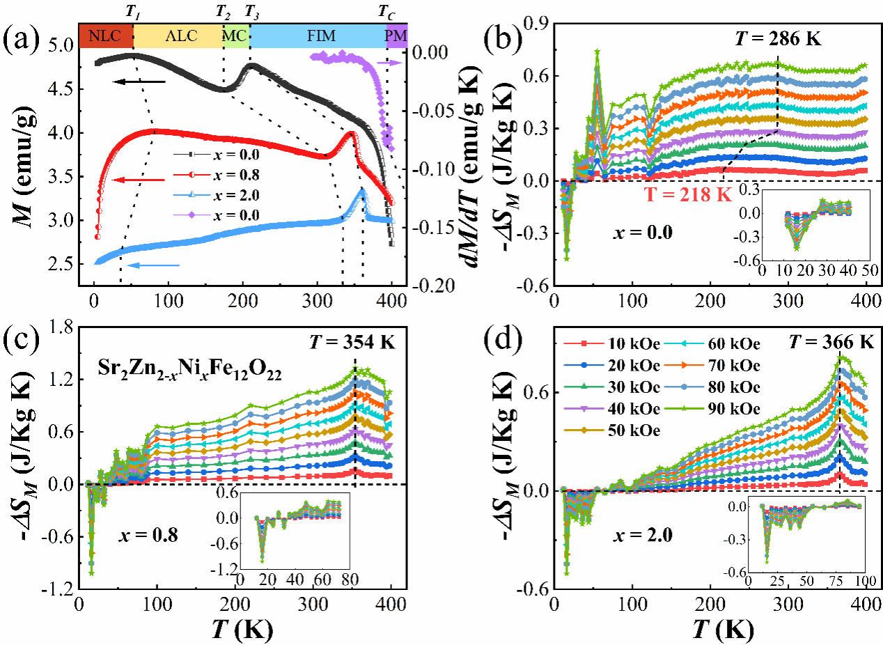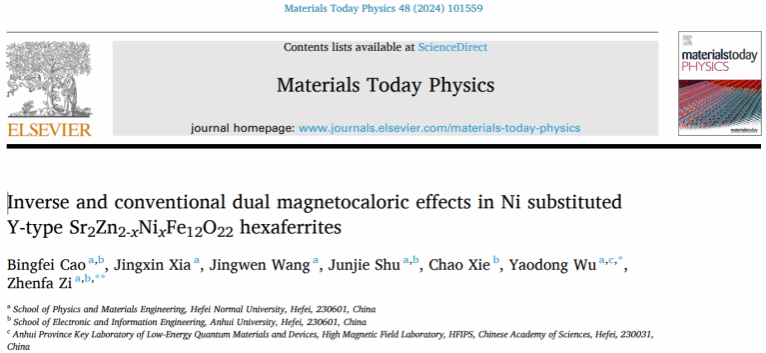 近日,永利yl23411集团与安徽大学联合培养的硕士研究生曹冰菲同学与我院本科生组成的学生科研团队,针对Y型六角铁氧体的磁热效应与磁制冷性能开展研究并取得重大进展,相关成果发表在《Materials Today Physics》(中科院一区,IF = 10.0),论文题目为“Inverse and conventional dual magnetocaloric effects in Ni substituted Y-type Sr2Zn2-xNixFe12O22 hexaferrites”。曹冰菲同学为本论文的第一作者,永利yl23411集团新能源材料与器件专业的吴耀东、訾振发老师为本论文的共同通讯作者,永利yl23411集团为唯一通讯单位。