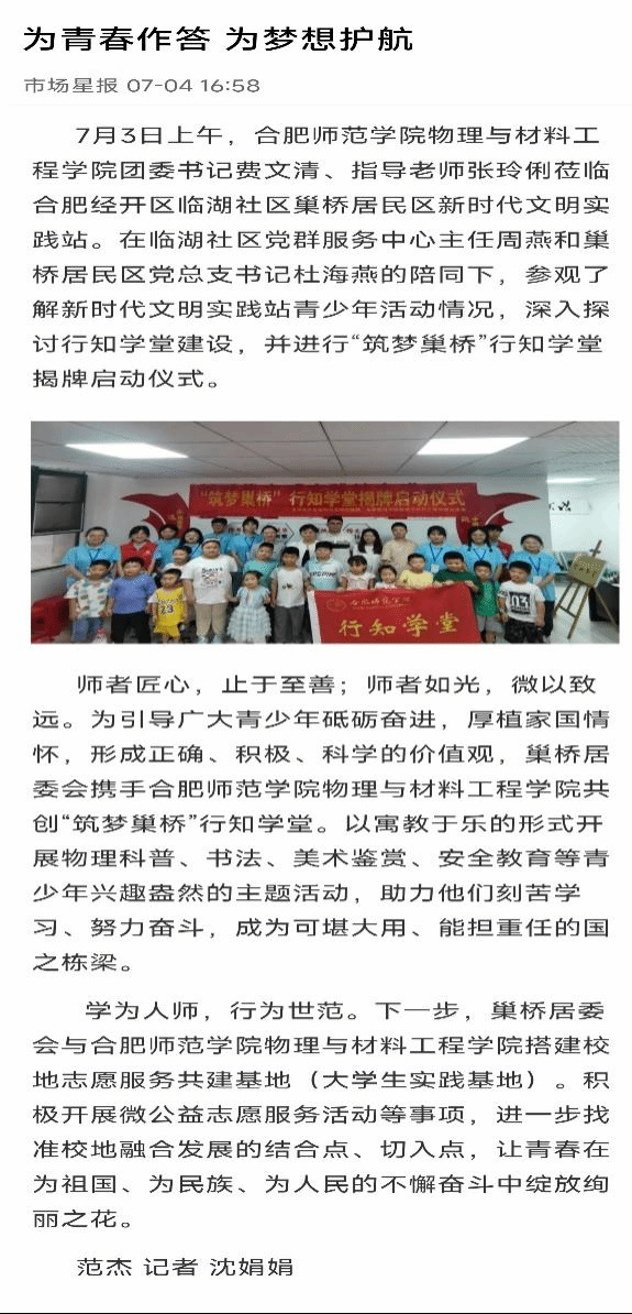 本网讯2023年7月3日,永利yl23411集团分团委在合肥市经开区临湖社区巢桥居民区新时代文明实践站举行 “筑梦巢桥行知学堂”揭牌仪式与开班仪式,本次实践活动将为小学员们开展为期三周的安全教育,兴趣培养,科学普及,心理教育等活动。