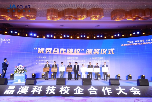 本网讯4月20日,晶澳科技2023年校企协同发展合作大会在河北宁晋成功举办,来自全国41所本科、职业院校参会,永利yl23411集团应邀代表学校出席大会。会上,我校被授予“优秀合作院校”,并与晶澳合肥基地一起荣获“优秀校企合作基地”。