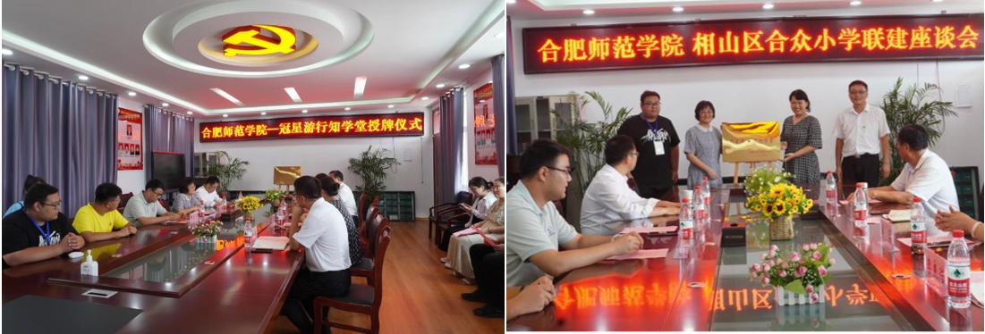 结业仪式间隙,唐洁一行和相山区教育局副局长邢诚诚、合众小学校长李良浩等相关负责同志进行了座谈,并为“冠星游”行知学堂授牌。唐洁代表学院感谢相山区教育局和合众小学给予的支持与帮助,简要介绍了我校“行知学堂”实践活动的宗旨与特色,邢诚诚对“小先生”们的真诚努力表示肯定,对“行知学堂”的做法与成效大为赞赏。双方就扩大“行知学堂”实践平台、留守儿童服务活动和校本教材开发等方面的合作问题进行了深度交流。(永利yl23411集团:费文清 张飞)