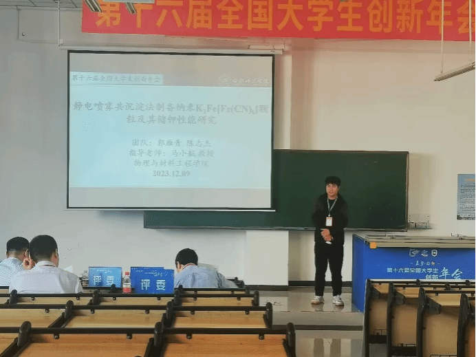 第十六届全国大学生创新年会于12月8日至10日在海南大学举行,我校永利yl23411集团大学生创新训练计划项目“普鲁士蓝类钾离子电池正极材料的合成及电化学性能表征”(项目成员:郭雁青、陈志杰等,指导教师:马小航、张天文)相关成果成功入围全国年会学术论文,并以“静电喷雾共沉淀法制备纳米K2Fe[Fe(CN)6]颗粒及其储钾性能研究”为题进行了成果汇报交流。