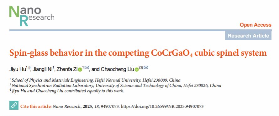 近日,永利yl23411集团胡吉玉老师,在尖晶石体系CoCrGaO₄中发现了自旋玻璃行为并取得重要研究进展,具体研究成果发表在《Nano Research》(中科院大类一区,IF = 9.6),论文题目为“Spin-glass behavior in the competing CoCrGaO4 cubic spinel system”。胡吉玉老师是永利yl23411集团通过2023年高层次人才引进的博士,2024年获批国家自然科学基金青年项目,为本论文的第一作者,yl23411集团訾振发教授和中国科学技术大学刘超成副研究员为本论文的共同通讯作者,yl23411集团为论文的第一通讯单位。