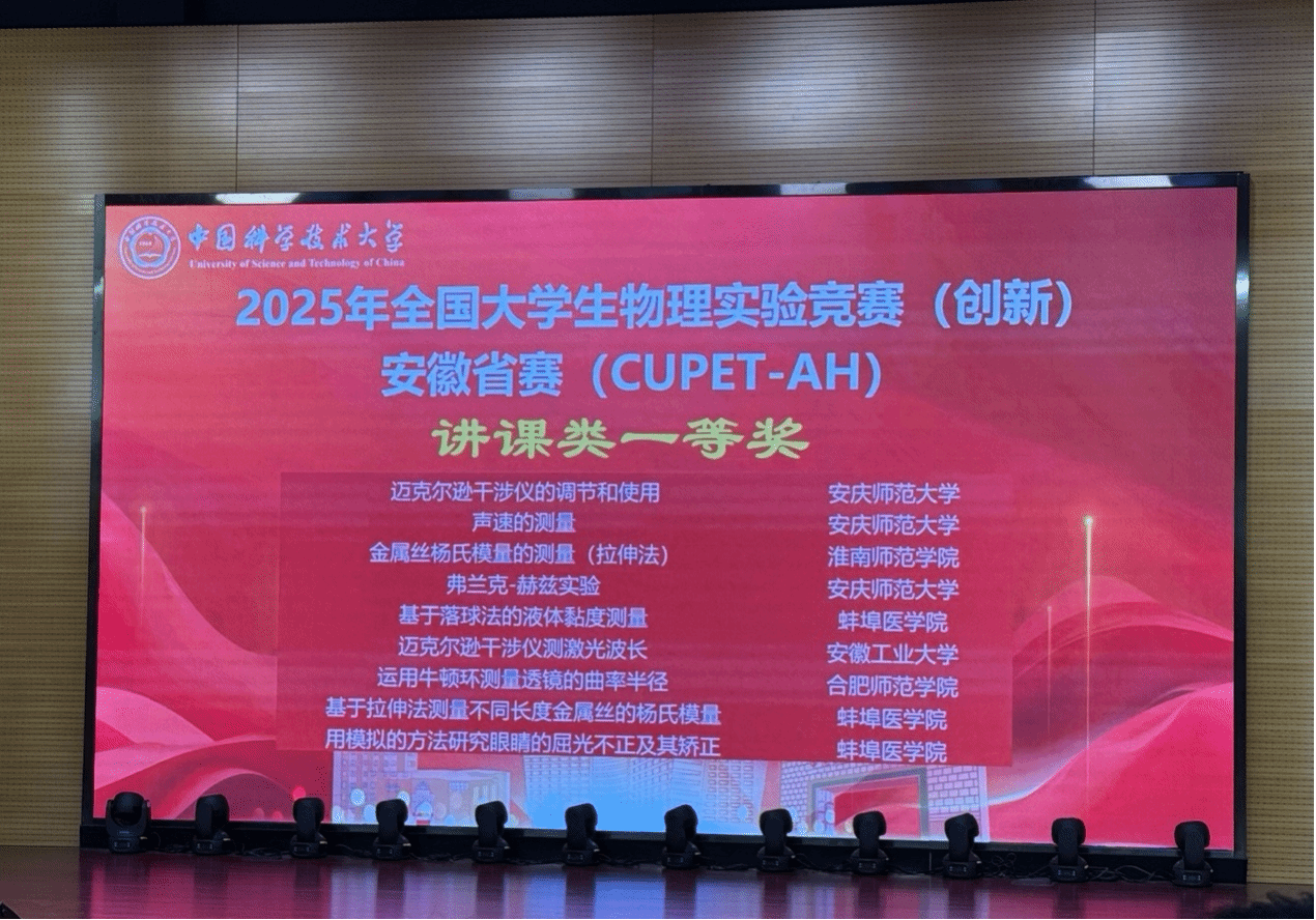 8月30日—9月1日,由安徽省大学物理课程教学指导委员会、安徽省物理学会和安徽省高校大学生物理实验竞赛组织委员会主办,中国科学技术大学物理学院承办的第一届安徽省高校大学生物理实验竞赛(创新)决赛(CUPET—AH)在中国科学技术大学举办,省内26所高校的272支队伍参与决赛角逐。我校永利yl23411集团派出的9支代表队参加,经过省赛初赛和决赛,获得一等奖1项,二等奖2项,三等奖5项。不仅开辟了新征程,更是以敢打敢拼的精神、优异的成绩凸显了学校近年来在大学物理及实验的教学创新和人才培养上取得的显著成效。