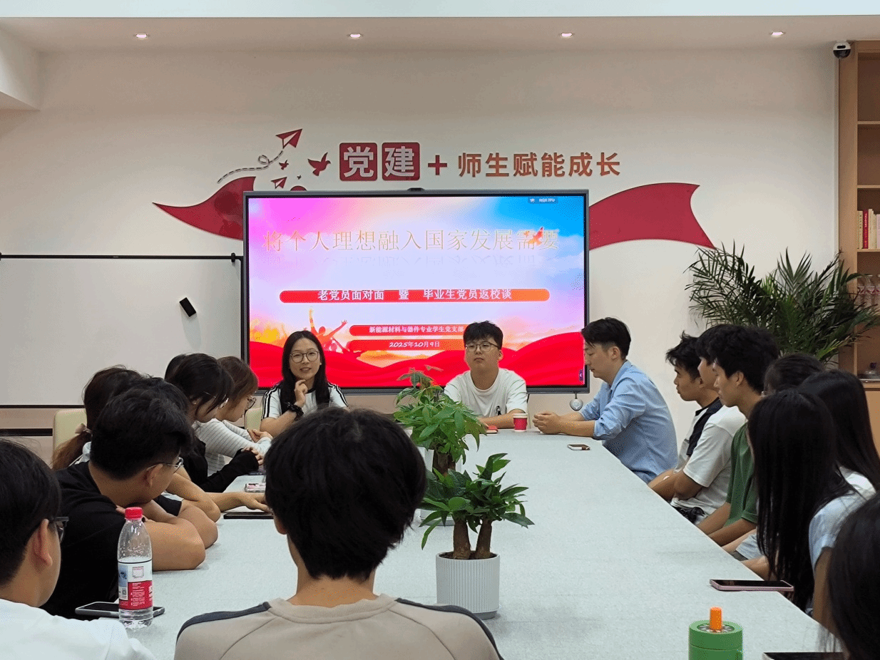 正值学校建校70周年校庆之际,新能源材料与器件专业学生党支部于10月9日在滨湖校区一站式社区组织开展"新老党员面对面"主题党日活动。党支部邀请已毕业学生党员代表陈晓艺、鲍振洋返校,与在校学生党员、入党积极分子代表举行交流座谈会,会议由党支部书记韩翔主持。