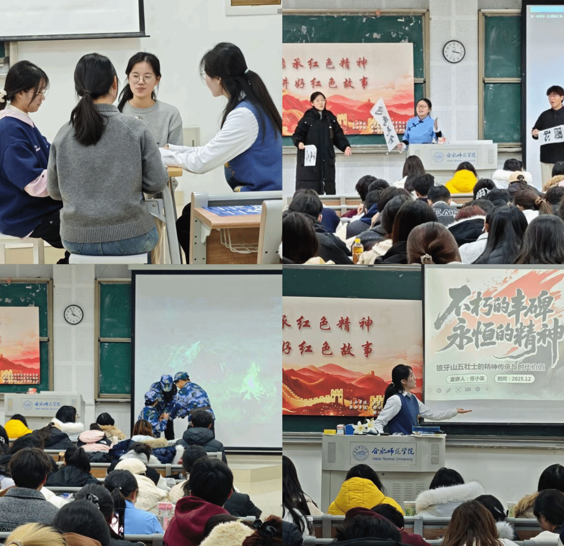 比赛中,各个学院的选手间随机分组展现风采,彭子俊、孙宝莉、康语彤以激昂的演绎,诠释出五四运动中青年的勇毅与担当;胡盼阳、王传远、刘熳淇声情并茂地讲述《金色的鱼钩》的故事,让现场的观众感受到老班长的责任与担当;同时王金、刘煦、汪忆昕、任小蕊则以真情实感的表演,展现出解放战争时期“四朵金花”卧底于国民党时期的聪明才智。