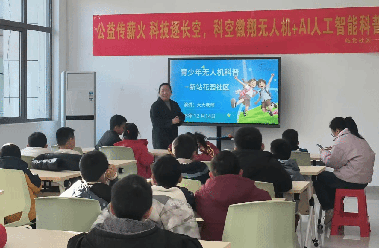 社区课堂里,队员们协助专业老师细致讲解,图文并茂,结合趣味动画从无人机的核心构造、飞行原理、安全操作规范,到相关赛事亮点,再到AI人工智能在智能家居、教育、娱乐等领域的生活化应用,为孩子们奉上一堂精彩十足的科普公开课。屏幕上滚动的酷炫无人机和花式飞行影像引得孩子们阵阵惊呼;趣味盎然的AI互动案例演示,如语音助手实时对话更是抓住了孩子们的注意力。孩子们积极互动,竞问抢答,现场氛围浓厚,充满欢声笑语。