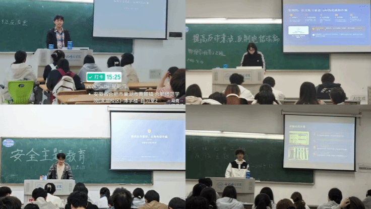 活动以班级和宿舍为重要抓手,深入推进反电诈宣传教育工作。作为反电诈宣传教育的核心载体,班级发挥着至关重要的作用。学院反诈小队走入各个班级组织开展反诈主题班会,围绕电信网络诈骗的新形势,结合真实校园诈骗案例,向同学们详细讲解各类诈骗的作案手法、识别方法和应对措施,同时组织观看防电诈警示视频,提醒大家时刻保持警惕,做到不轻信、不透露、不转账,遇到可疑或被诈骗情况及时向辅导员、保卫处以及校园警务室报告求助,让同学们进一步强化防范意识,筑牢思想上的反电诈“防火墙”。