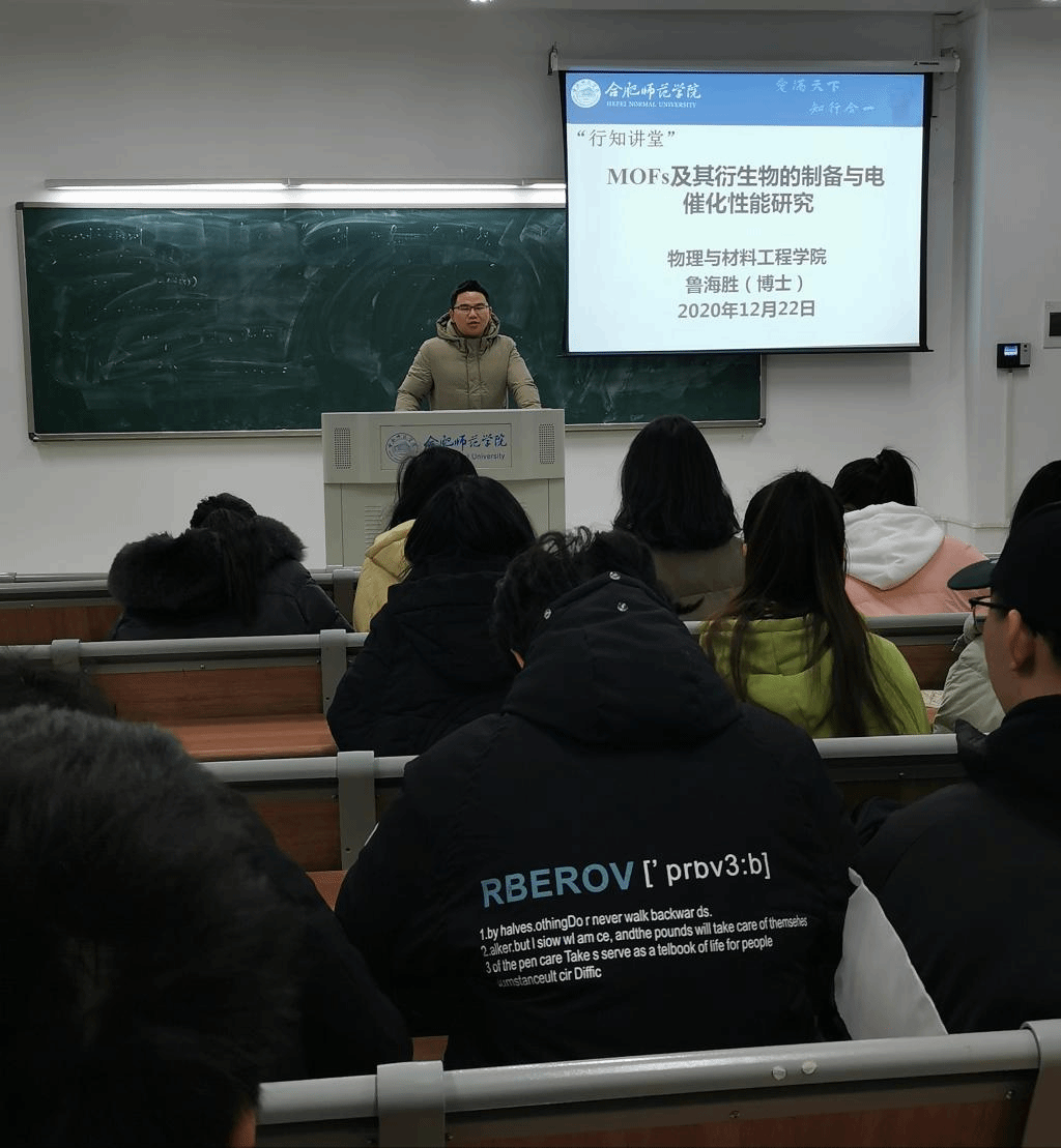 12月22日上午,“行知讲堂”学术报告在滨湖校区博学楼B310教室举行。本场报告由永利yl23411集团鲁海胜博士主讲,主题为“MOFs及其衍生物的制备与电催化性能研究”,2019级新能源材料与器件专业学生聆听了学术报告。
