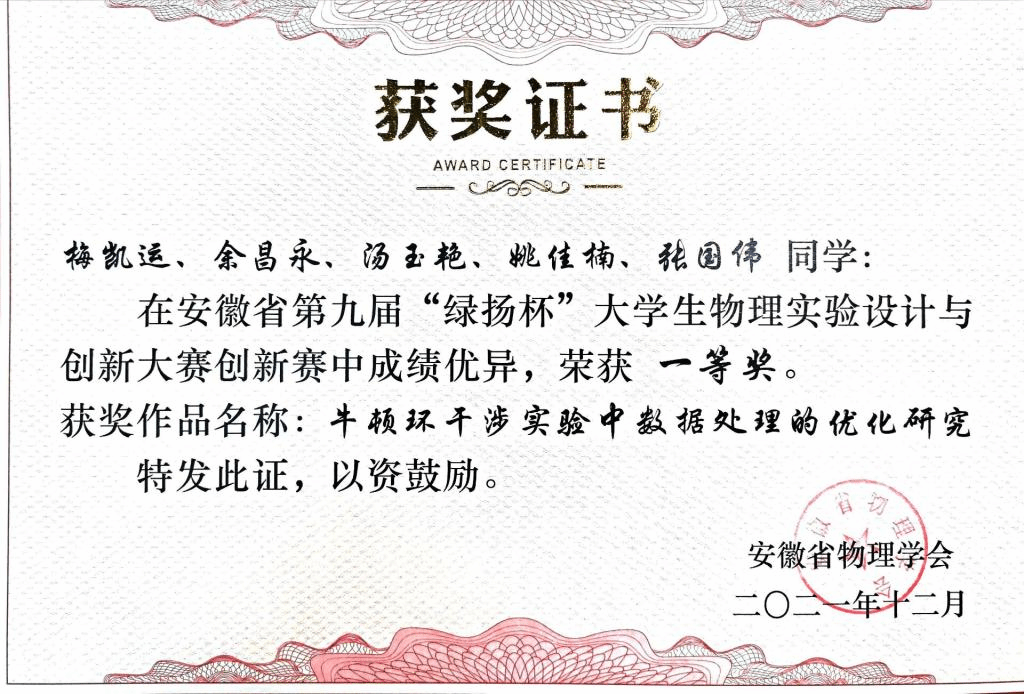 近期,2021年第九届安徽省大学生物理实验设计与创新大赛结果揭晓,我院三个参赛团队分别获得一个一等奖、两个三等奖。其中,永利yl23411集团李仁文老师指导的梅凯运、余昌永、汤玉艳、姚佳楠、张国伟团队作品《牛顿环干涉实验中数据处理的优化研究》获一等奖;李仁文老师指导的汤玉艳、梅凯运、余昌永、张国伟、姚佳楠团队作品《牛顿环干涉实验中螺钉压力影响规律的探究》,陶蕊、冯源、李冬鹏老师指导的张翰明、李刚宇、刘瀚扬、伍宏伟、郜栋梁团队的作品《纹影效应演示仪》分别获得三等奖。